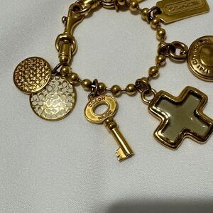 A versatile gold-tone charm bracelet featuring signature Coach accents, including a cross, key, and lock pendants. Stylish and timeless accessory.