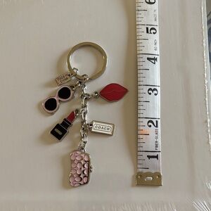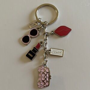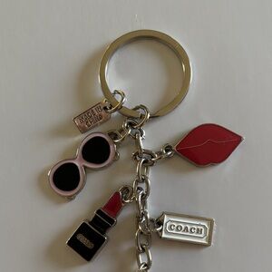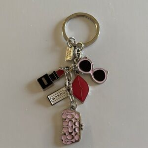Playful enamel charm keyring by Coach. Features pink sunglasses, red lips, lipstick and logo tag. Cute patterned pink purse charm adds flair. Silver-tone hardware and key ring included.