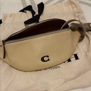 Elegant cream leather waist bag with signature 'C' emblem. Features adjustable strap and zip closure.