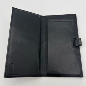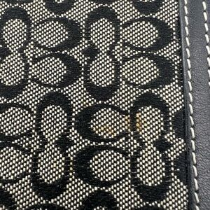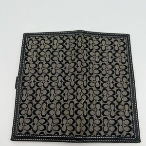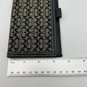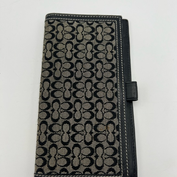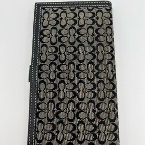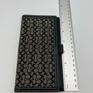 Stylish Coach checkbook with a monogram pattern. Elegant design with secure closure.