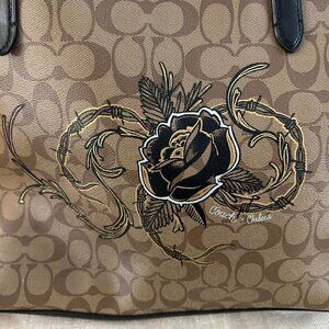 Limited edition. Features brown signature “C” jacquard canvas with black leather trim, embroidered tattoo-style rose and thorn design on the front, dual leather shoulder straps, open top with magnetic snap, and spacious black interior with zip and slip pockets.