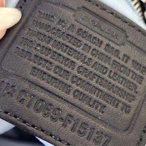 C237 Coach Chelsea Heritage Stripe Signature Tote Black White Coated Canvas is Coach style number F15137, made in 2010. The exterior of the bag is made of coated canvas in Coach's signature C pattern in a striking black and white combo. The handles, trim, corners, and other accents are made of black leather. Silver-tone hardware. Front slip pocket and a d-ring to clip on key. Rear slip pocket. Top-zip closure with leather zipper pull, and the zipper is designed to separate fully for ease of entry into the bag. The interior is light blue canvas and has 2 slip pockets and 1 zipper pocket with leather zipper pull.