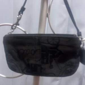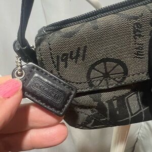 This elegant Coach clutch wristlet in black features a sophisticated monogram pattern, perfect for adding a touch of luxury to any ensemble. Crafted with attention to detail, it combines style and practicality in a compact design. Ideal for both casual outings and formal events, this wristlet is a versatile accessory for any occasion.