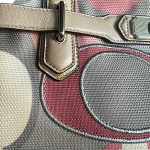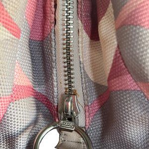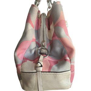 Peach, salmon-pink, gray & cream textured signature fabric with touches of silver. Soft leather strap and trim is creamy champagne color; silver tone hardware. Snap exterior pocket. 3 interior compartments, center is zipped.