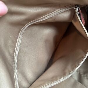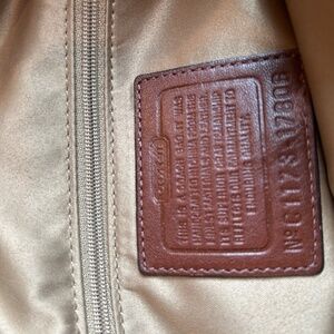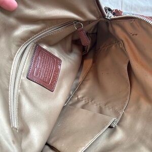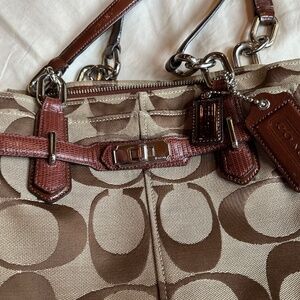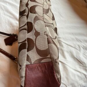 Coach signature sateen fabric (brown and tan) with leather trim. Inside zip, cell phone and multi function pockets. Center zip compartment and snap outer pockets. No holes or tears. Smoke and pet free home.