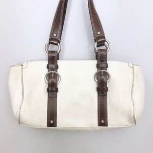Coach “Chelsea” leather satchel bag. Ivory white leather with brown leather trim. Silver-tone hardware with adjustable buckles on straps. Top zipper closure. Green interior lining with zipper pocket and 2 pouch pockets. 16” width and 8.5” height. Interior is in excellent condition, exterior leather has some minor blemishes throughout (see pictures; priced accordingly)