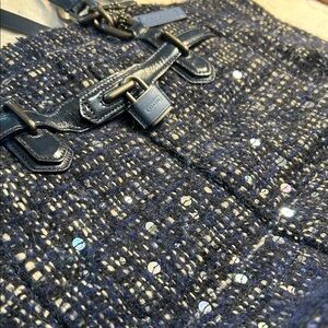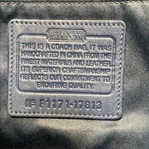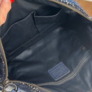 Gorgeous for fall- Large Coach tote- EUC- Inside is perfect, along with all charms and handles. Only a few small scuff on bottom, so proved to reflect. Lovely bag- navy, white, black and silver are main colors so very versatile! Offers welcome!