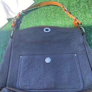 Dark brown leather purse by Coach. Features a sleek design with a front pocket and secure closure. Great used condition. Only used a couple of times. There is a small stain on the inside of the purse as u can see in the last picture, otherwise, great condition. No cracks in the leather. Hardware looks good, no scratches. Will come with white coach bag. Smoke free home. Thank u for looking.