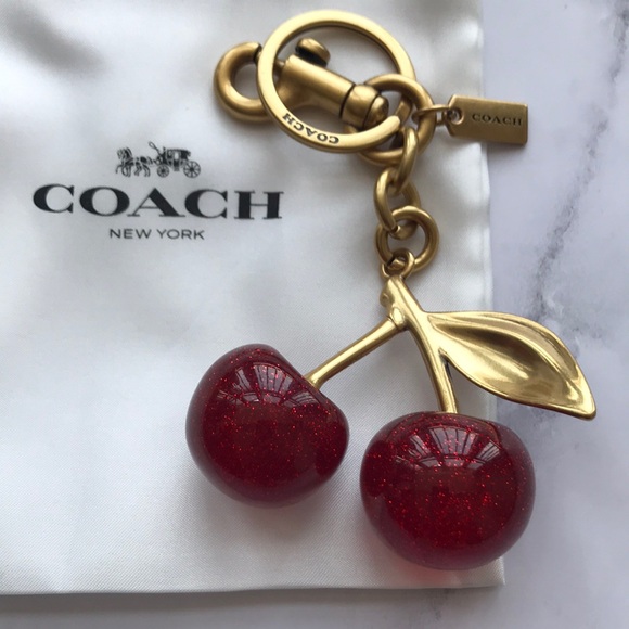 Coach keychain with red cherry design and gold accents.