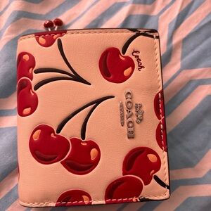 Chic Coach wallet with vibrant cherry design. Features red cherries on a light background.