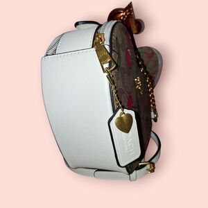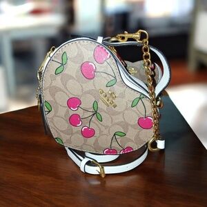 This stylish Coach heart-shaped bag features a playful cherry print on a brown background. Perfect for adding a touch of fun to any outfit.