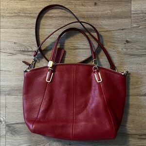 Elegant cherry red leather bag by Coach. Features sleek silver accents and a versatile strap.