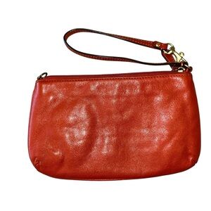 Elegant Coach wristlet in Orange leather. Features a convenient wrist strap and sleek design.