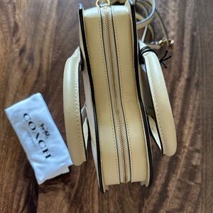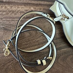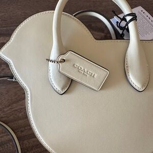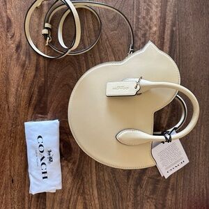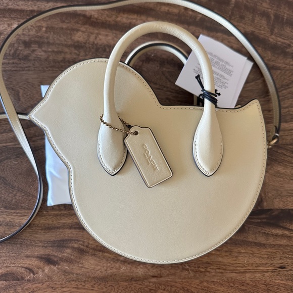 Super cute bird-shaped mini handbag in cream leather (color is called moonlight on the coach website). Cute top handles with detachable shoulder strap- brass zip and hardware on strap. Brand new, never used- comes with original dust bag and tags still on! The perfect handbag for spring and Easter!