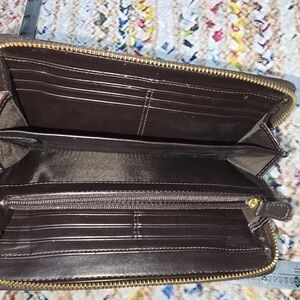 Elegant leather wallet by Coach. Features a sleek design with subtle pleats.