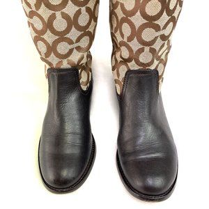 Coach Chrissi Monogram beige brown riding boots size 5,5. grate condition. Authentic pair of Coach CHRISSI TALL RIDING BOOT FOR WOMEN. UPPER MADE WITH WATER AND STAIN RESISTANT 12CM SIGNATURE LOGO JACQUARD FABRIC AND SOFT CALF LEATHER . CUFF DETAILED WITH EMBOSSED HORSE AND CARRIAGE COACH LOGO .PULL UP STYLE .CUSHIONED FULL LEATHER LINNING . NON- SKID LEATHER SOLE . Easy fit. Never worn, very clean! simple, comfortable, , perfect for everyday fashion!