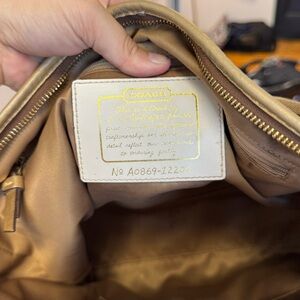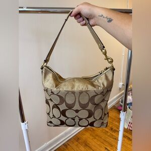 Add a pop of vintage charm to your wardrobe with this authentic Coach shoulder bag. Featuring the iconic signature “C” jacquard print in brown and khaki, this style is elevated with metallic gold leather trim and bold floral appliqué detailing in white and yellow. The roomy interior includes multiple pockets for organization, lined in luxe satin fabric.