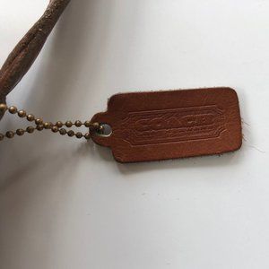 Exterior slip pocket at back; adjustable leather strap; brass turn lock at front flap; raw leather interior; interior zipper pocket with Coach creed and serial number.
