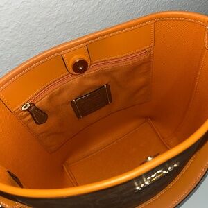 Spacious city bucket bag in excellent condition. Like new. Includes shoulder strap and crossbody strap. PLEASE NOTE: Original hangtag is included but not the chain to secure it. Also please note color difference between the hangtag and the orange on the purse.