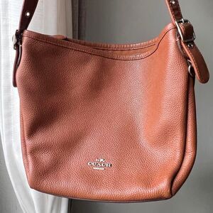 Timeless and versatile Coach bag in a rich cognac brown pebbled leather. A structured yet roomy everyday shoulder bag with an adjustable strap for comfortable wear. Features the classic Coach logo on the front and zip-top closure.
