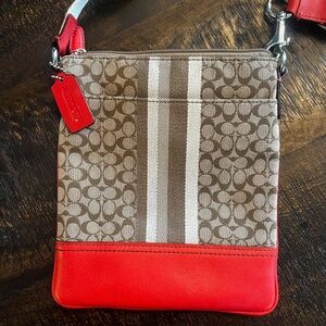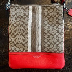 A stylish and functional Coach crossbody bag featuring the iconic Coach signature pattern. Stylish and versatile, this Coach signature crossbody bag features a striking orangish/red and tan design. Perfect for everyday use, it combines fashion with functionality. Features an exterior back slip pocket, an adjustable crossbody strap and a zip closure.