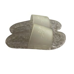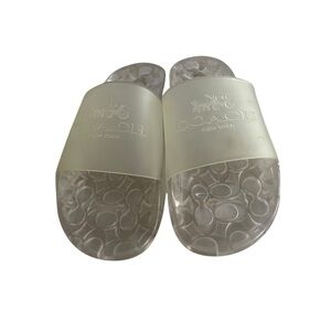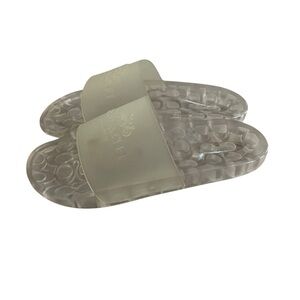 Stylish clear slide sandals. Features Coach logo on strap. Comfortable and chic design.