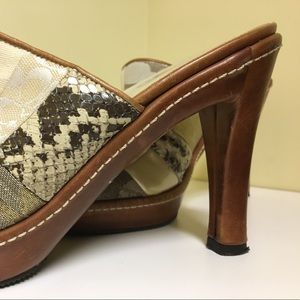Cool Coach Clogs- worn a couple of times only. Shades of gold, cream, snakeskin and leather. Minor spots on front part of left clog. Not noticeable when you are wearing them (but I've attached a picture so you can see)