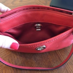 Coach leather red/orange clutch with pocket inside and outside with silver clasp. Easily fits an iPhone 6 plus plus lipstick, key, credit cards and pen. Great clutch to run into a store, restaurant and any day or time when you don't want to carry your larger bag or purse.