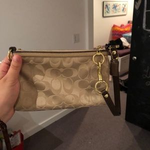 mid-size coach clutch with wrist strap. Tan with Coach logo and gold embellishment. NEVER USED BRAND NEW.