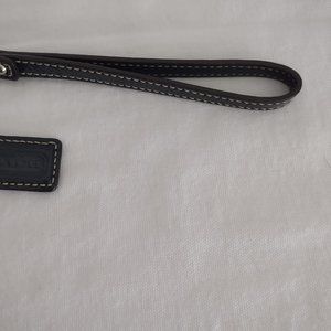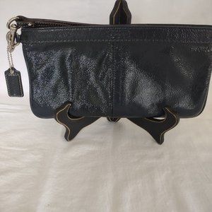 Pre owned but in new condition Coach wristlet. Navy blue textured patent leather with wrist cuff and coach fob. Silver hardware. Zippered top with inside pocket, green interior. Approximately 10 in long.
