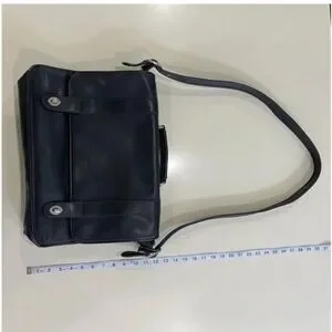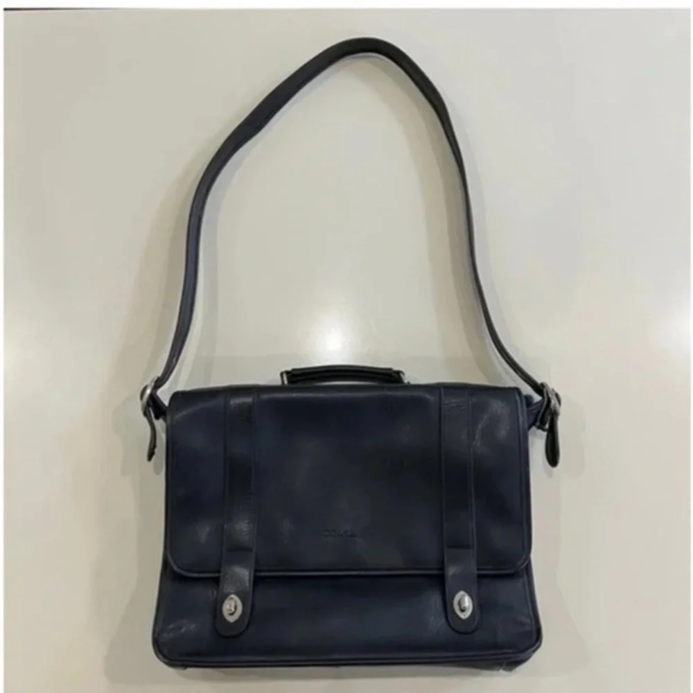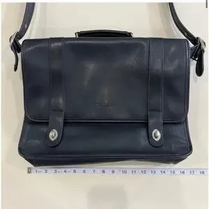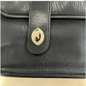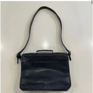 Made by Coach in 1994/95 It has a top handle, gold tone metal turn clasp / turnlocks latches. It has a back pocket that runs the width of the bag, and organizational pockets under the bags front flap for pens, business cards and mobile phone. It has two interior compartments, with one interior zippered pocket.