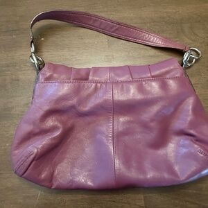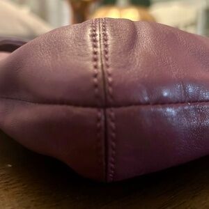 Vintage Coach Coach F17217 Hampton Baguette Sufflette Shoulder bag MSRP $348 Berry Purple medium shoulder bag. Sliver hardware, Flap Butter soft purple leather. Cream lining. Large buckle with silver tone hardware. Back open to place items in (see photo). Two sections on inside, one with two pockets for items such as glasses and a zipper compartment. Leather potion of strap is 15” long.