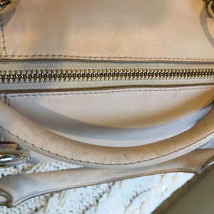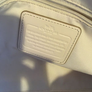 Gorgeous, soft saffiano leather in cream/beige. Coach hang tag. Interior zip pocket, plus two slip pockets. Double leather handles (5" drop) plus longer strap for shoulder wear (removable, about “24). The bag itself is in good condition, with a few minor scratches, a little wear on bottom feet hardware, and some discoloration near interior zipper. However, the handles will need some cleaning/care (please see pictures). With a little love it will look brand new! Approximately 15”L x 8.5”H x 4.5"W