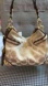 Chic Coach shoulder bag with signature pattern. Features satin and snakeskin touches. Ideal for stylish outings.