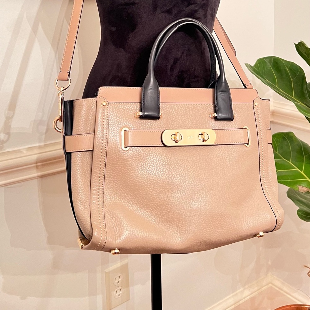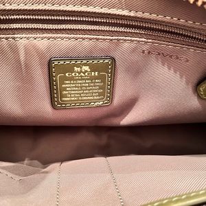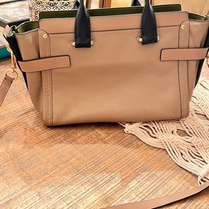 Gold hardware, top zip closure, interior zip pocket, two slip pockets, longer strap for crossbody wear. Leather.