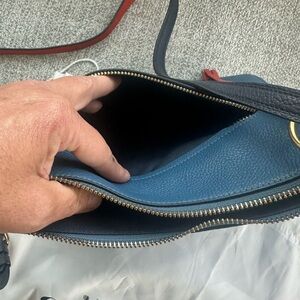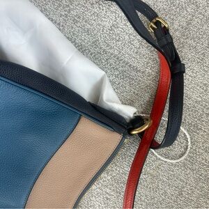 This is a preloved gorgeous Color block Navy, Taupe with deep red purse.