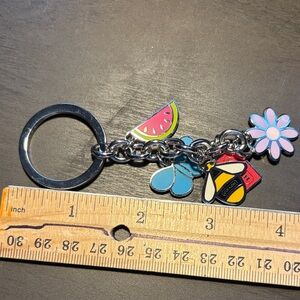 Fun Coach keychain with playful charms. Features pink, blue, and yellow accents. Perfect for bags or backpacks. NWOT, never used.