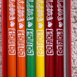 Bright and colorful Coach Poppy Pencil Paper Box with 6 Pencils. Features bold logo and dynamic patterns.