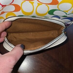 Vibrant Coach backpack with signature pattern. Features red, pink, orange, yellow, green, and blue accents.