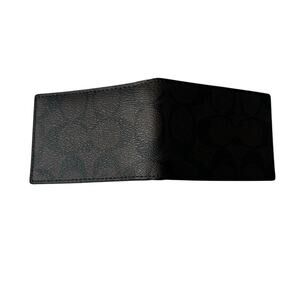 Coach Compact Billfold Wallet In Signature Canvas Mahogany Black. Features billfold style, signature canvas print, two interior card slots, and ID window. Excellent pre-owned condition.