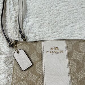Coach Corner Zip Monogram Zip Wallet Wristlet in pre owned condition. Please view l photos for light signs of wear. Measures about 5 3/4” across & 4” tall.