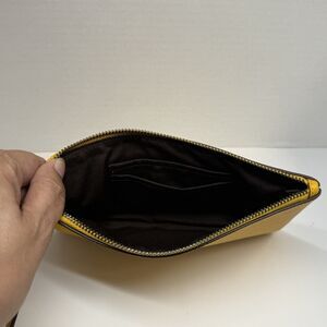 Great little compact wristlet thats perfect for throwing in your phone, credit cards, lipstick and keys. Use it as a single wristlet bag or throw it into your bigger bag. Measures approximately 7 3/4 inches wide by 4 3/4 inches tall. Inside has two slot pockets For credit cards or money. Comes in a fun, bright mustard colored yellow pebble leather with dark gray metal logo. Comes from a smoke free home. Brand new without tags.
