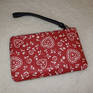 Coated canvas with heart and flower prints on red background. 2 credit card slots interior. Fabric lining. Leather wrist strap attached.
