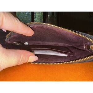 This Coach Corner Zip Wristlet is a stylish and functional accessory for any woman. Made of high-quality black leather, this pouch wallet features a strap, zipper, and logo accents that add a touch of elegance to the classic design. Measuring 6 inches in length and 4 inches in width, it is the perfect size for carrying credit cards and other essentials.
