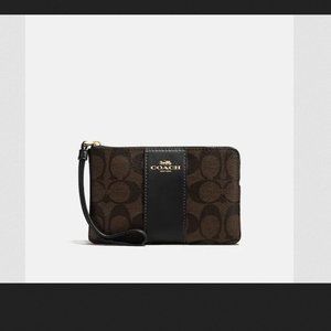 Coach Corner Zip Wristlet In Signature Canvas Gold/Brown Black