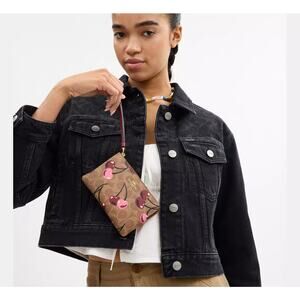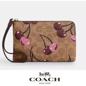 🍒 Coach Corner Zip Wristlet In Signature Canvas With Cherry Print