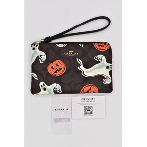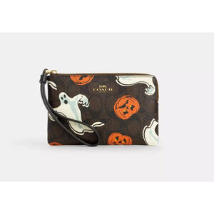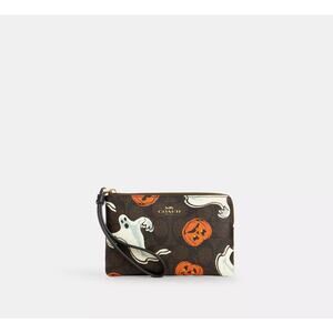Coach Corner Zip Wristlet In Signature Canvas With Halloween Print Walnut Ghost