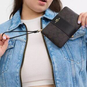 Our Corner Zip Wristlet is an everyday essential that won’t weigh you down. Crafted of Signature coated canvas and smooth leather, this small wristlet wallet is compact yet functional, with space for your keys, cards and even an iPhone (up to a 15 Pro Max). This canvas wristlet in Signature canvas features a wrist strap for ease and a zip-top closure to secure your items. To keep your cards handy on the go, organize them in the convenient built-in slots.