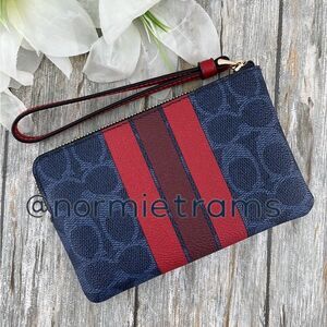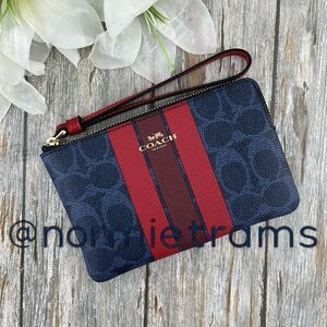 Coach Corner Zip Wristlet In Signature Canvas With Varsity Stripe Wallet Bag
