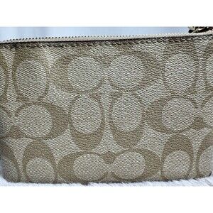 Coach Corner Zip Wristlet In Signature Tan Canvas With Pink Stripe and Strap